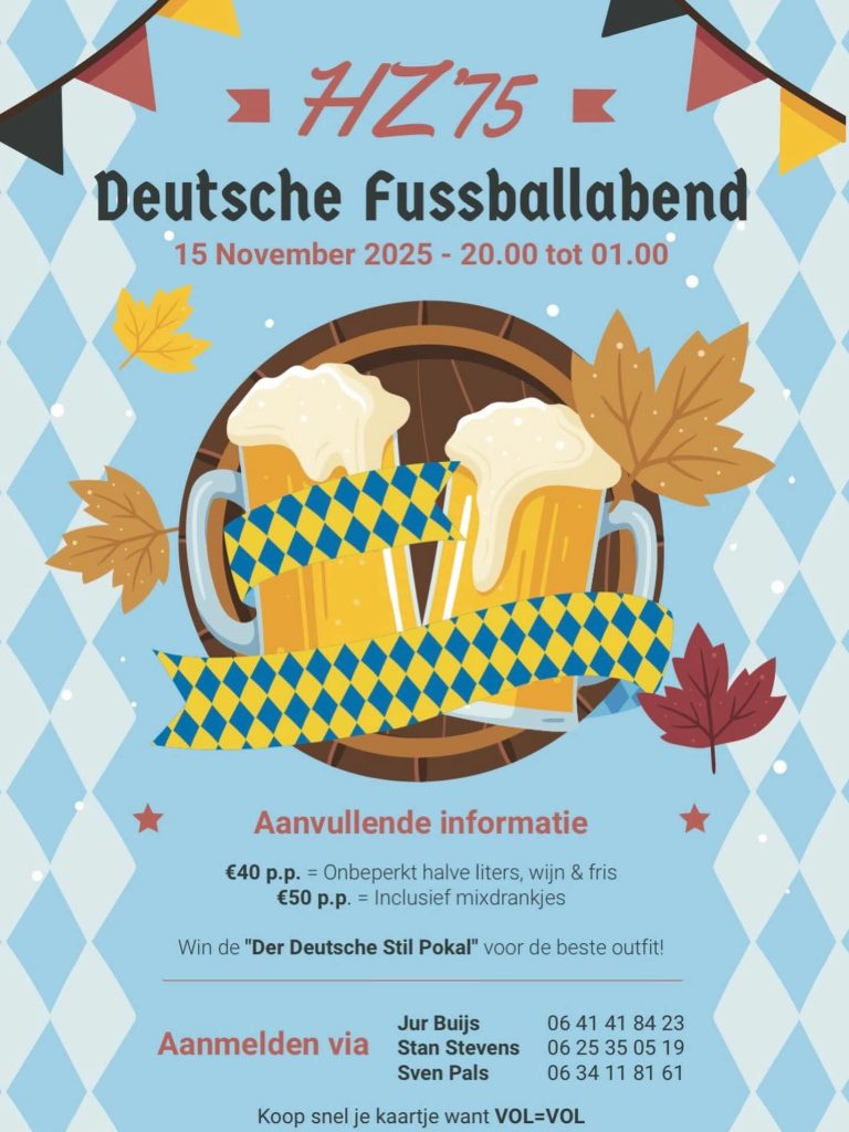 Liebe freunde! Het is wieder zover! De evenementencommissie van HZ’75 organiseert na een afwezigheid van 3 jaar endlich weer een Deutsche Fussballabend. Op 15 november geht es wieder loss. Sporpark het Moerbos aka Estadio Het Moerbos zal voor eine abend omgedoopt worden tot Augustiner Festhalle der Múrhboss. Voor slechts 40 Euries geniet u de gehele abend onbeperkt van alle Deutsche geneugten das lebens.